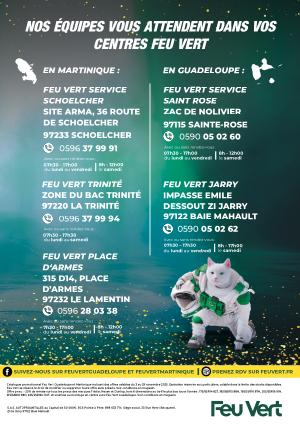 Catalogue promotionnel Feu Vert Guadeloupe et Martinique incluant des offres valables du 3 au 29 novembre 2025. Opération réservée aux particuliers, valable dans la limite des stocks disponibles. Feu Vert se réserve le droit de modifier ou supprimer toute offre sans préavis. Voir conditions en magasin. Offre pneu:-20 % de remise sur tous les pneus des marques Tristar, Nexen et Dunlop, hors 6 dimensions au tarif le plus bas toute l’ année: 175 / 65R14 82T, 185 / 65R15 88H, 195 / 55R16 87H, 205 / 55R16 91H, 215 / 65R16 98H, 225 / 65R16C 112T. et soumise au montage en centre auto Feu Vert Guadeloupe. Voir conditions en magasin.