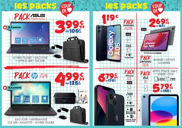les packs 3 9 100 9 €, 99 €, 00 4x 4 9 125 9 €, 99 €, 00 4x SACOCHE + IMPRIMANTE CLÉ USB + RAMETTE + SOURIS FILAIRE disque 256 SSD 8 Go RAM Celeron N4500 15,6 pouces + PACK G9 15,6 pouces + disque 128 SSD 4 Go RAM Pentium N5030 PACK E510MANS SOURIS FILAIRE + SACOCHE + OFFICE 365 + CLÉ USB