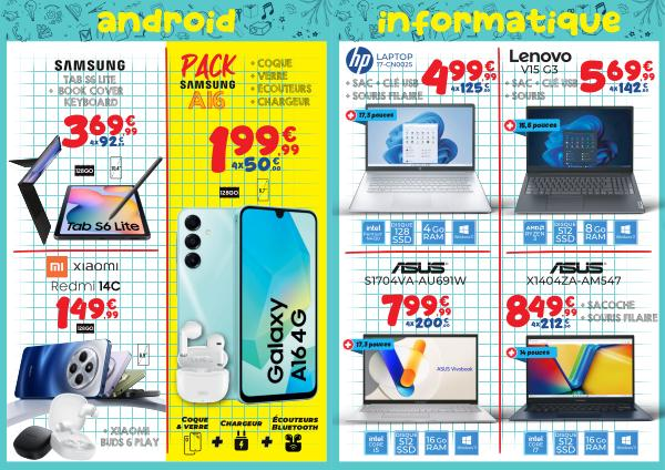 android + COQUE + VERRE + ÉCOUTEURS + CHARGEUR PACK A16 3 6 92 9 €, 99 €, 50 4x TAB S6 LITE + BOOK COVER KEYBOARD 128GO 1 9 50 9 €, 99 €, 00 4x Coque & verre Chargeur Écouteurs Bluetooth 6,7” 128GO 128GO 1 4 9 €, 99 Redmi 14C + XIAOMI BUDS 6 PLAY 6,9” 10,4”